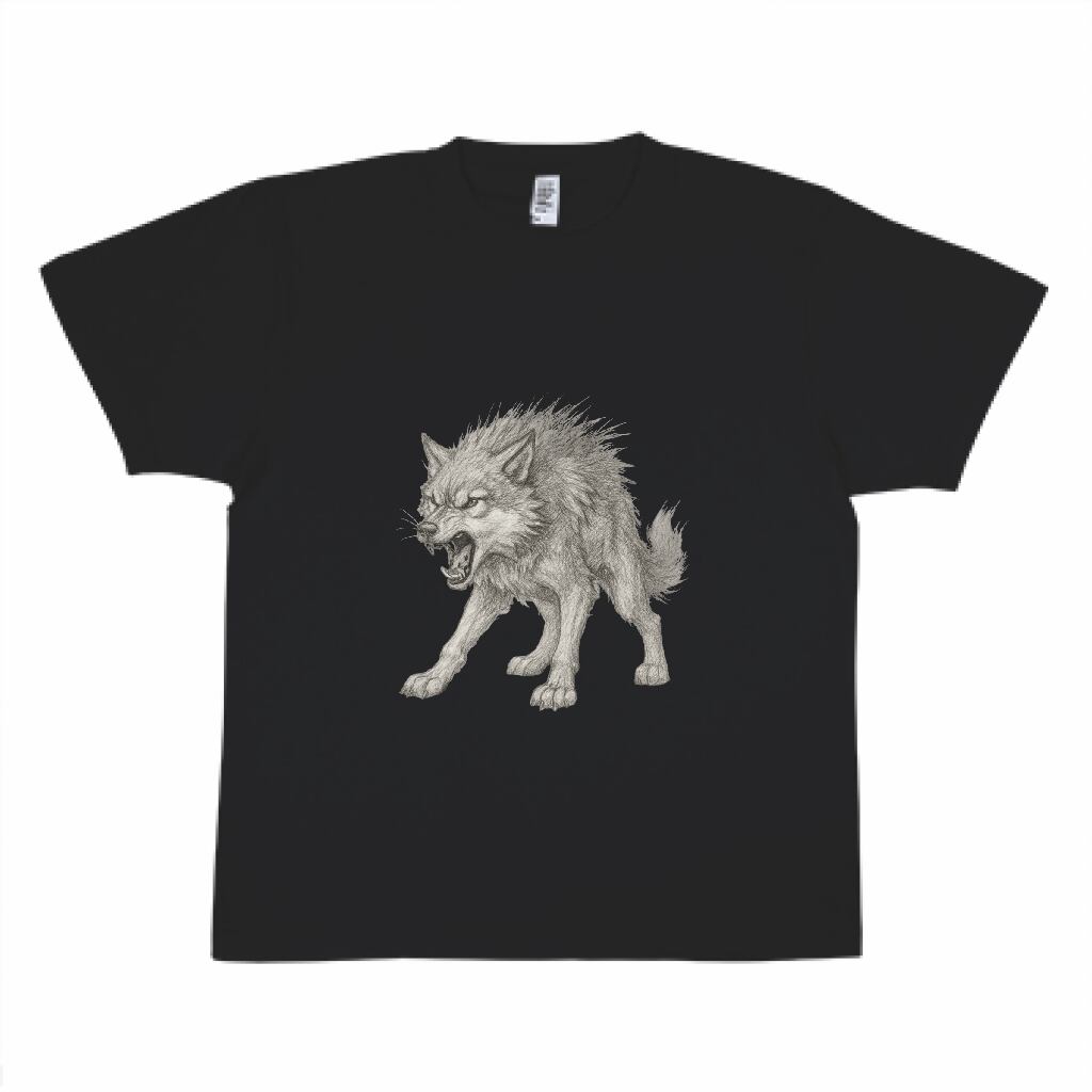 力強く野性的なオオカミのイラストが印象的な一枚です。黒地にシルバーグレーで描かれたオオカミは、牙をむき出しにして威嚇するような表情で、まさに野生の迫力を表現しています。毛並みの質感まで細かく描き込まれたアートワークは、見る者に強いインパクトを与えます。